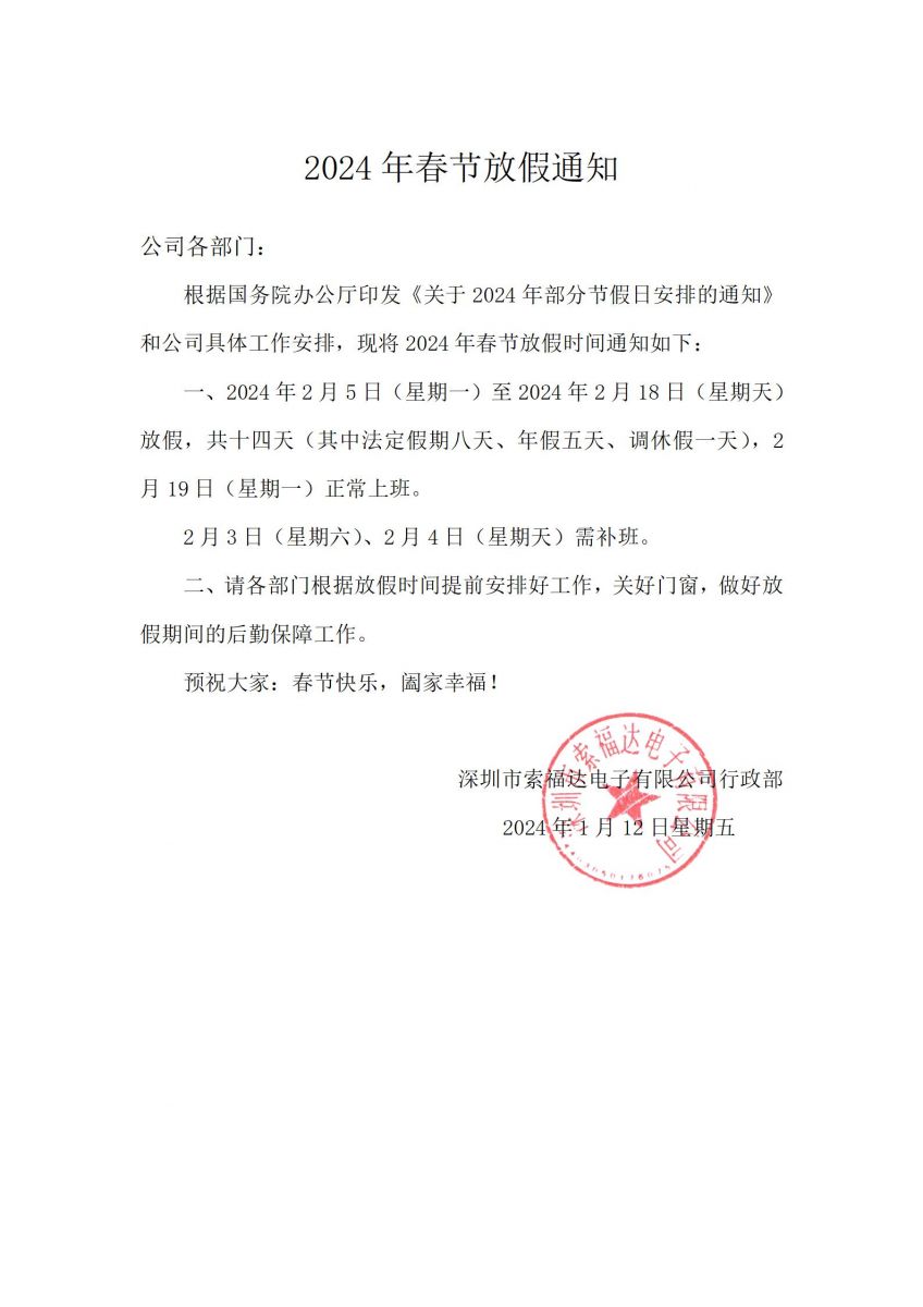 我司于2024年2月5日(星期一)至2024年2月18日(星期天)放假,共十四天,2月19日(星期一)正常上班。