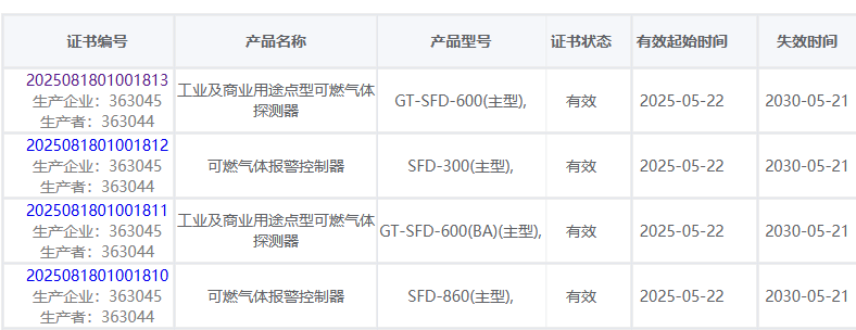 GT-SFD-600、SFD-300、GT-SFD-600(BA)、SFD-860已成功取得國(guó)家強(qiáng)制性產(chǎn)品認(rèn)證證書。